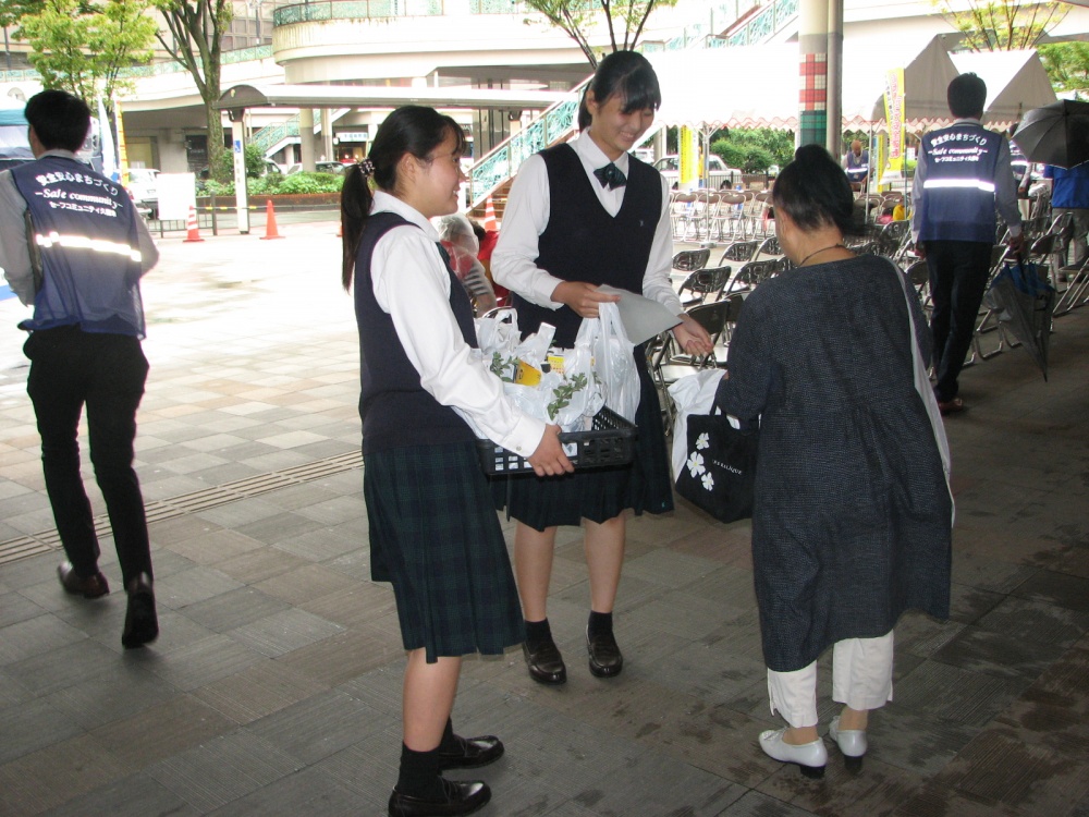 久留米筑水高校の生徒の皆さんからの花の小鉢の贈呈式、あかつき幼稚園の園児からの交通安全宣言が行われ、街頭キャンペーンとして会場周辺の通行人に花の小鉢及び啓発物を配布しました。