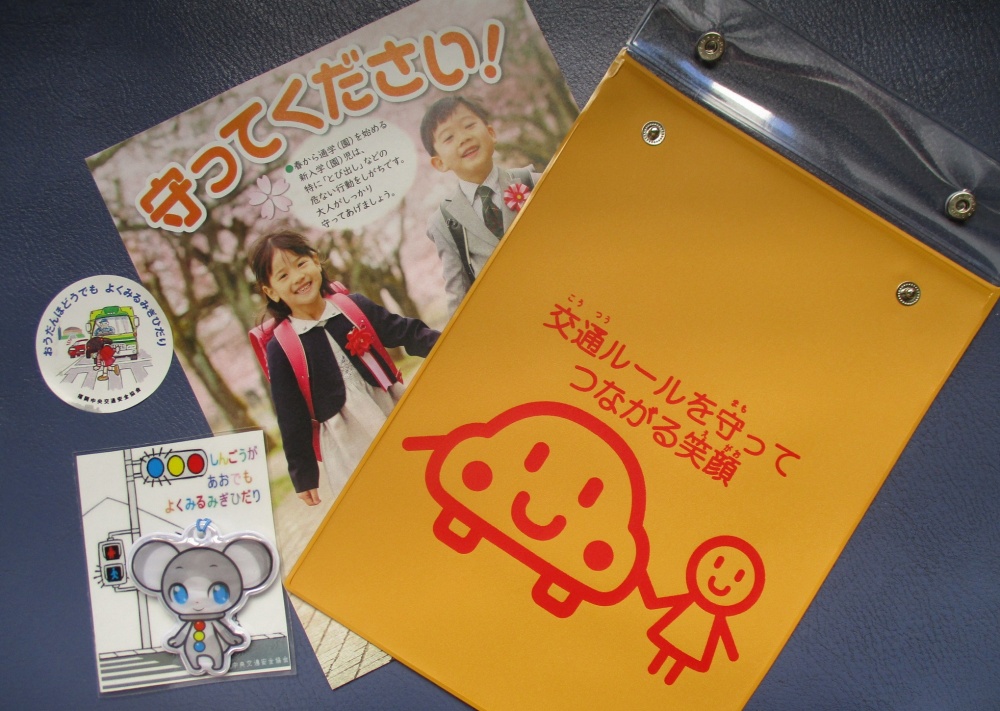また、新学期こどもの交通事故防止チラシ約5,000枚を区内の全自治協議会を通じて地域の皆さんに回覧していただくようお願いしたり、区内の新一年生全員(約1,800人)には交通安全グッズ(写真左)のプレゼントを準備中です。
