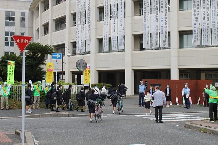 ・両校の自転車通学の高校生等に対して、正門入り口でハンドボードをかかげて、安全運転等を呼びかけた。
