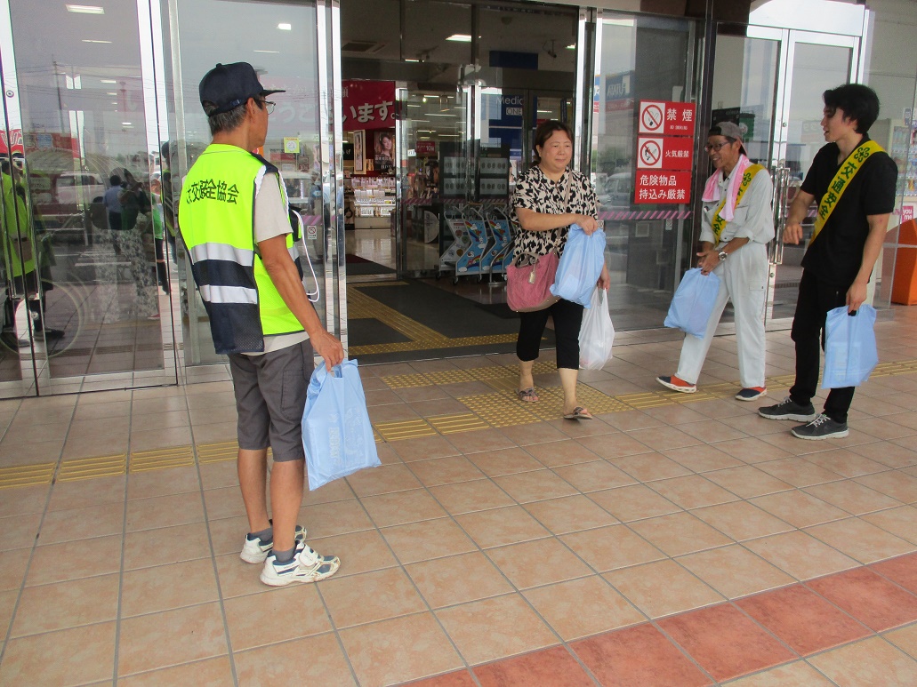 参加者は、来店者に対して「交通安全県民運動が始まります。交通事故防止なす(なし)」等声掛けをしながら、パンフレットや反射材とともに地域で収穫した茄子を配付しました。